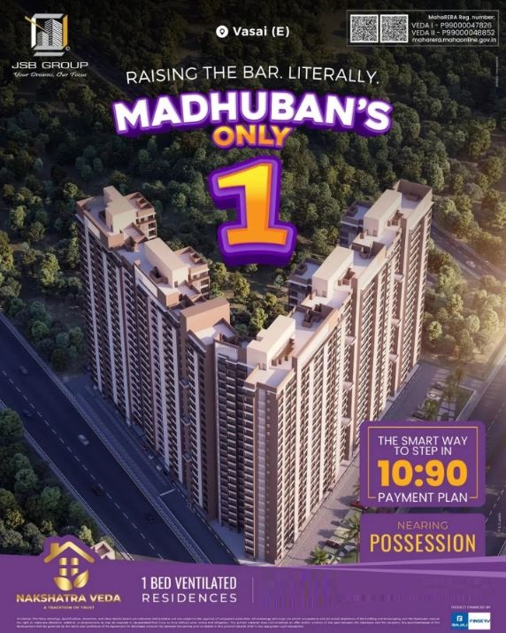 Nakshtra Veda will be constructed on 5 acres of land parcel, 6 tower with Ground + 22 floors having 1 BHK, & 2 BHK premium residences. JSB Nakshatra Aazstha project is located On Madhuban, Gokhivare, Vasai East, Mumbai with Gokhivare Road - 2.4km, D-Mart - 3.9km, Vasai Railway Station - 4.6km from the project. JSB Nakshatra Aazstha Vasai East project Internal amenities likes of Vetrified tiles, Granite Kitchen, Earthquake resistance, Kitchen plat...orm, ss sink & many more. JSB Group Vasai East external amenities project has 25+ luxurious amenities with likes of Club house, Swimming pool, Amphitheater, Party lawn, kid's play area and many more. JSB Group Nakshatra Veda Vasai East project has one type of car parking facility i.a Ground level. JSB Nakshatra Veda Rera possession is December 2025 and Target possession is December 2023. Carpet Area & Floor Plan of Nakshatra Veda project has 1BHK and 2BHK premium residences with 1BHK carpet area range of 385 to 430 sqft and 2BHK of 590 sqft usable carpet area. JSB Nakshatra Aazstha Tower floor plans will have 7 flats & 3 lift 2 staircases on each floor. JSB Nakshatra Aazstha Vasai East Project maintenance varies with the configuration and the carpet area which are as follows 1BHK of (1500 - 2000) per month and 2BHK of (2000 - 2500) per month. JSB Nakshatra Aazstha project sample flat is ready to view at the site. JSB Nakshatra Aazstha price & its details can be found in the price section & JSB Nakshatra Aazstha brochure can be downloaded from the link mentioned below. Project has been praised by the home buyers & JSB Group Vasai East review is 4 out of 5 from over all the clients who have visited the site.